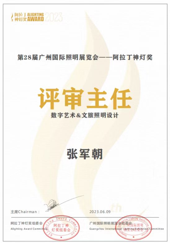 会长张军朝出任第十一届阿拉丁神灯奖评审会“设计奖--数字艺术&文旅照明设计”评审主任。 2023.04.12,阿拉丁神灯奖组委会正式邀请会长张军朝担任第十一届阿拉丁神灯奖评审会“设计奖--数字艺术&文旅照明设计”评审主任。